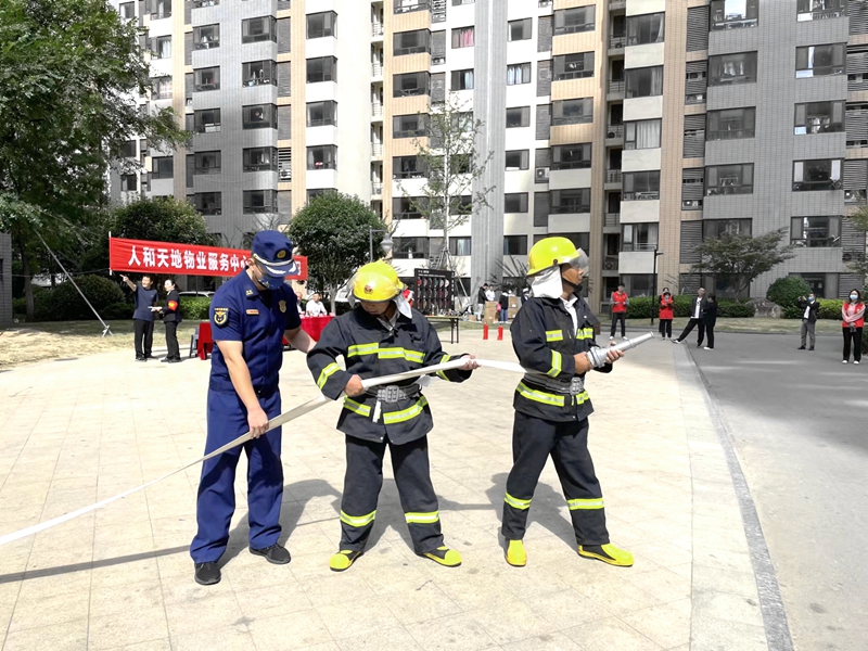 活动当天,人和天地物业服务中心组织工作人员开展了火情处置消防演练,并邀请到市消防大队、财贸医院工作人员讲解灭火器、消防栓、消防水带等器材的使用方法和伤员急救知识。