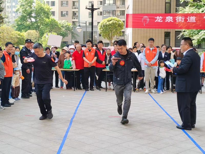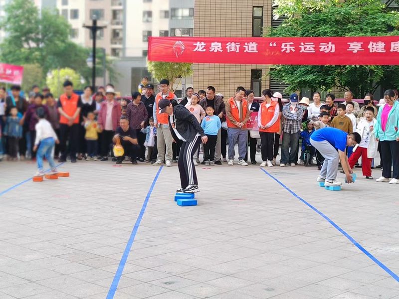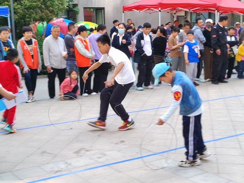 活动现场,居民们积极参与,热情高涨。摸石过河、滚铁环、踢毽子、趣味保龄球、拔河等传统运动项目不仅考验了参赛者的身体协调性和团队协作能力,更激发了大家童年的回忆。同时,现场还设置了旱地龙舟、运转乾坤等亲子游戏和才艺展示环节,为家庭成员提供了共同参与的机会,增进了亲子关系。