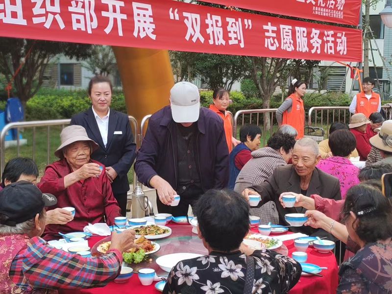 活动当天,人和天地小区内张灯结彩,洋溢着浓厚的节日气氛。社区广场上,彩旗飘扬,横幅高挂,到处可见“尊老敬老,情暖重阳”的温馨标语。一大早,社区工作人员和志愿者们便忙碌起来,他们精心布置场地,准备丰盛的宴席,只为给社区内的老年朋友们送上一份特别的节日祝福。